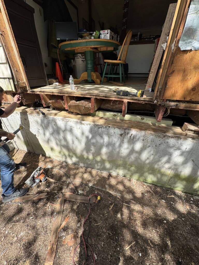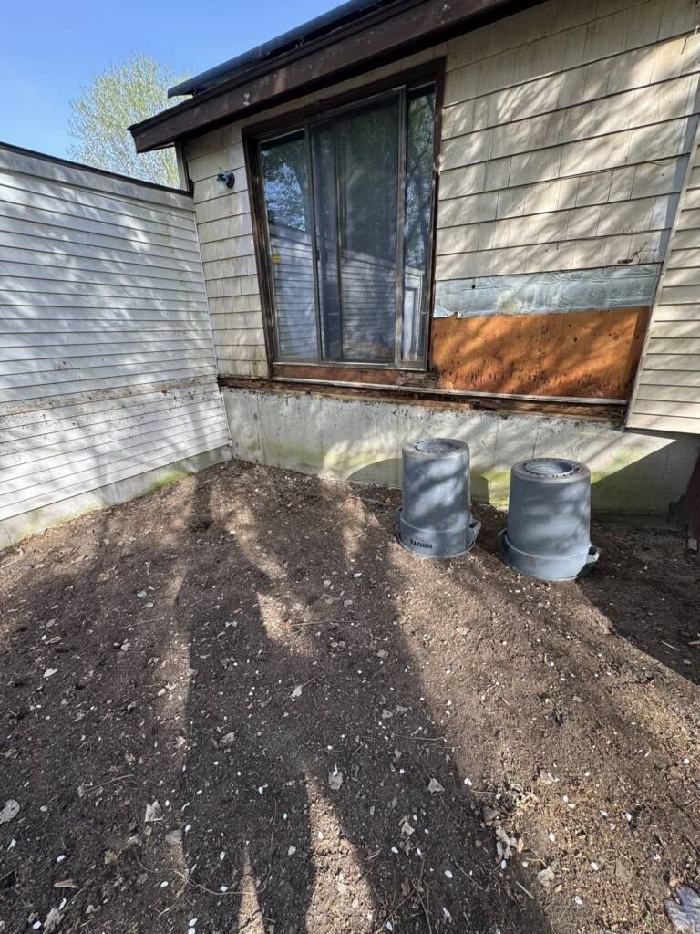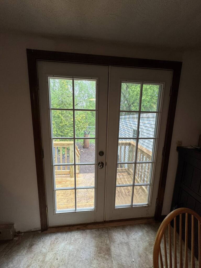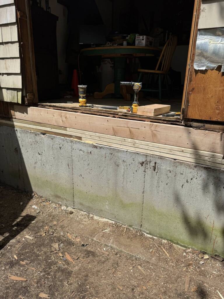 Back Entry Way Refresh! 8 times out of 10 when we replace an exterior entry door we also find a rotted sill plate. This one was by far the worst! This one was completely rotted down to the foundation causing the exterior wall to sag. This required lifting portion of the wall in order to get the wall and floor back to its proper position. The customers can now enjoy a side rear entryway to their home without a single worry!